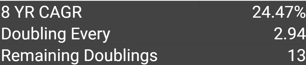 The Dashboard page starts off with a bold overview of the most important thing. Your CAGR (Compound Annual Growth Rate) and time to double.
