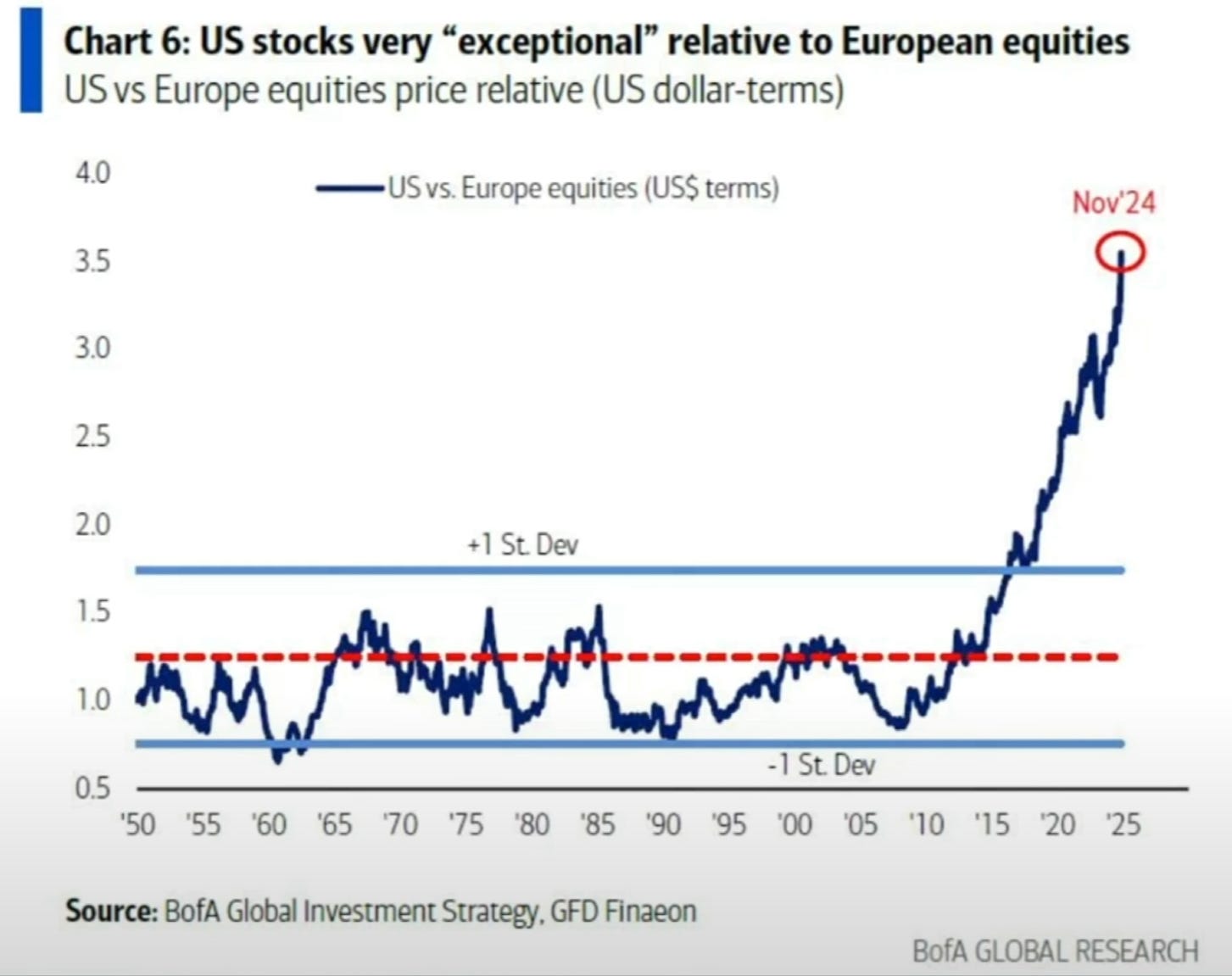 Lets take a look at why I think the S&P 500 is overpriced. This first chart came from Mike Maloney, showing the overweight allocation to USA, neglecting Europe.