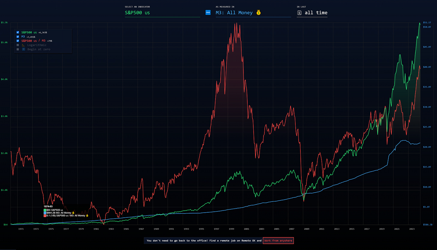 In this chart taken from inflationchart.com, the red line shows the correlation between printed money (M3 money supply) relative to the S&P 500.