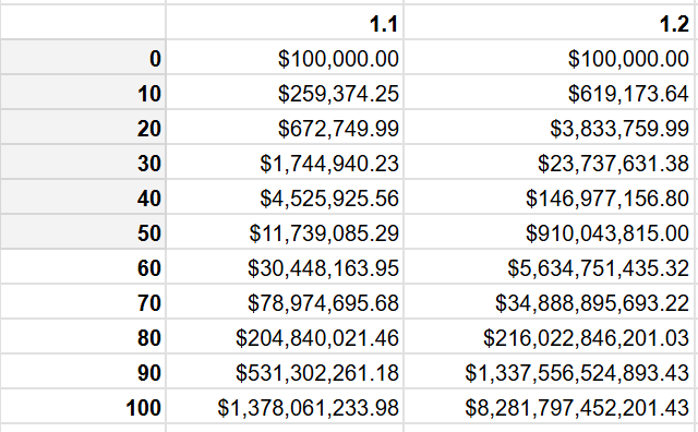 You can see the effect of time on wealth. We have 10% on the left and 20% return on the right.
