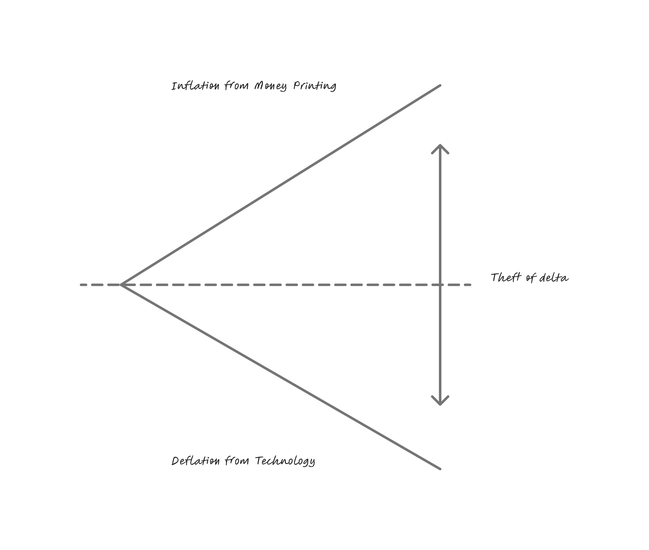 The illustration above shows the gap between the benefits of reduced costs and the increasing costs from inflation. If you are not seeing the deflationary benefits from the presence of technology in our day to day lives - it would suggest that this value is being siphoned off.